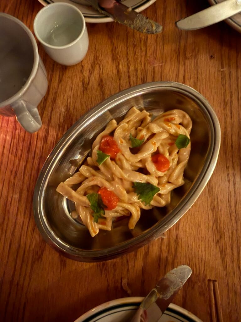 The entrance set the tone with moody purply pink lighting. But once inside, the space was warm, sophisticated, and cozy. This theme was carried over into the plating of the creative dishes presented on a thoughtful mix of beautiful Japanese china and utilitarian stainless steel, reinforcing the restaurant’s blend of refinement and relaxed izakaya culture.